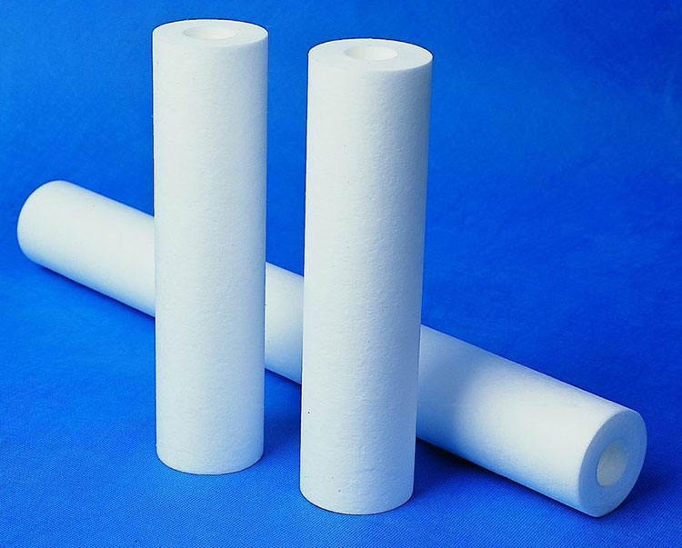 PP棉濾芯:采用無毒無味的聚丙烯顆粒,經加熱、熔融、紡絲、牽引、接收等工序纏繞粘結而成的管狀濾芯。濾芯的結構由外向內,越靠近濾芯內層,孔徑越小,過濾精度越高。聚丙烯棉濾芯具有流量大、耐腐蝕、耐高壓、成本低等特點,主要用于阻隔水中的鐵銹、泥沙、懸浮物等大顆粒物。